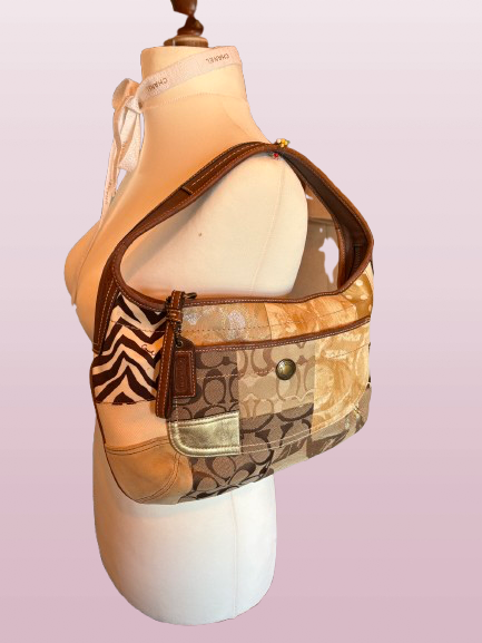 Coach Soho Hobo bag featuring the iconic brown signature monogram pattern and leather accents.